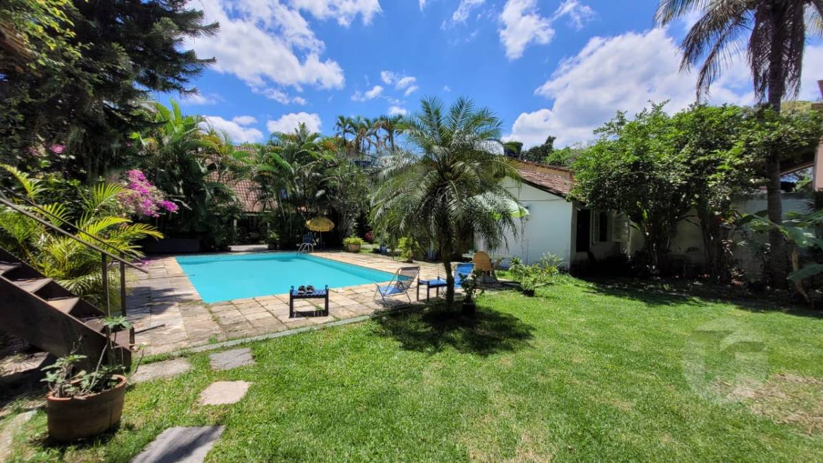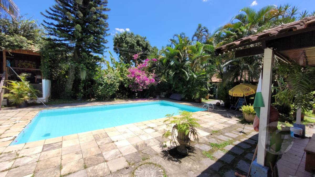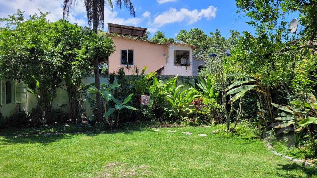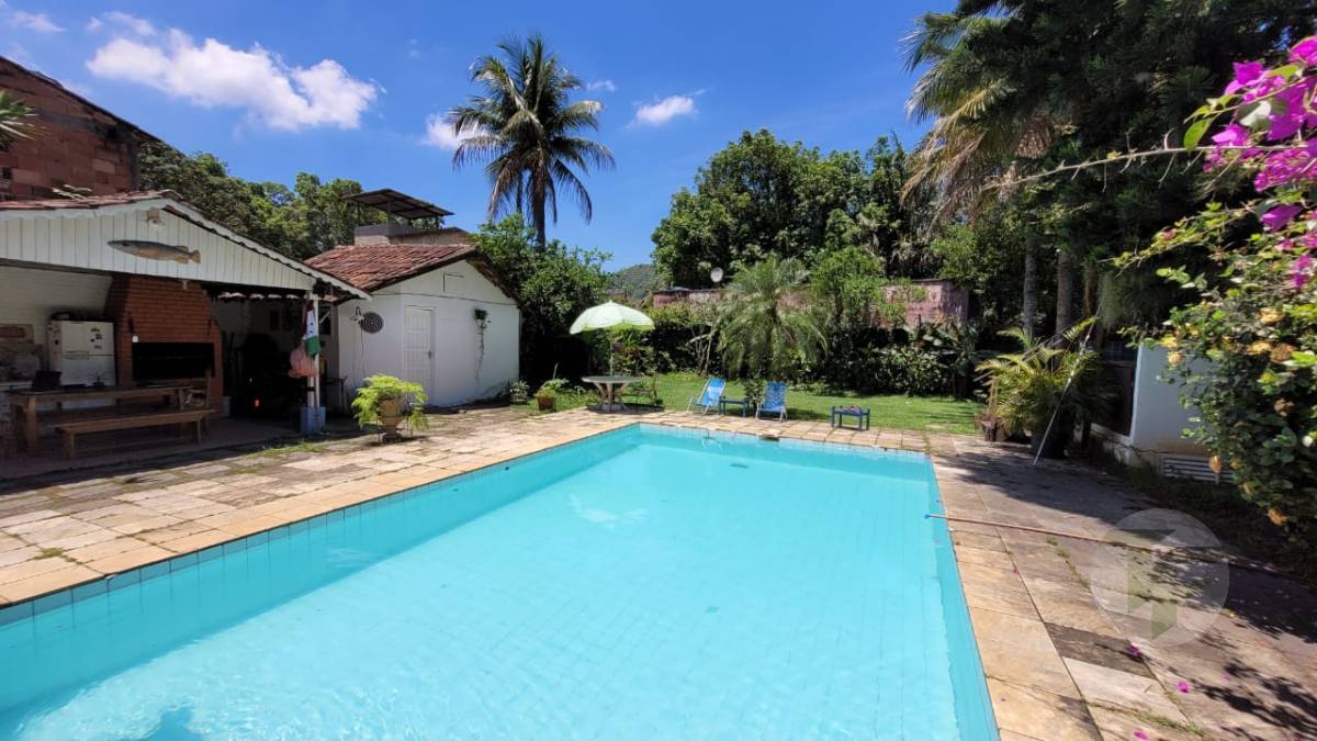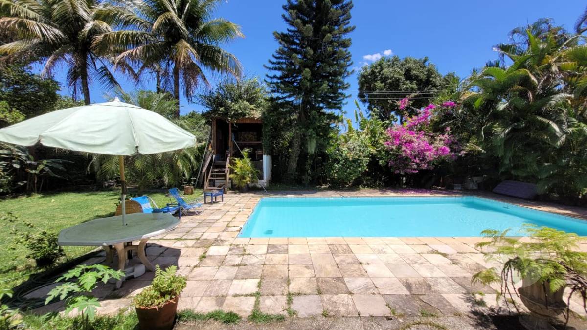 Excelente casa duplex oferecendo uma bela sala para vários ambientes, três quartos, sendo duas suítes, banheiro social, cozinha com área de serviço, varanda, área externa com piscina, ampla área verde e árvores frutíferas. Duas casas de hóspedes e mais uma casa de serviço.